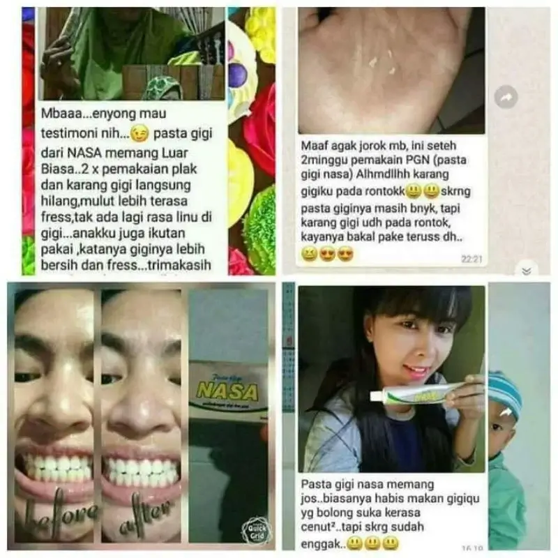 Pasta Gigi NASA sangat berkhasiat untuk membersihkan gigi, membuat gigi tampak lebih putih, serta menyehatkan gigi dan gusi. Manfaat Pasta Gigi Nasa dari kandungan Anti bacterial acid adalah sebagai pembunuh bakteri, mencegah infeksi, hingga menghentikan pendarahan pada gusi. Sedangkan Anti decay agent atau zat anti pembusukan dalam Pasta Gigi NASA dapat menurunkan jumlah bakteri di mulut dan mencegah proses pembusukan.